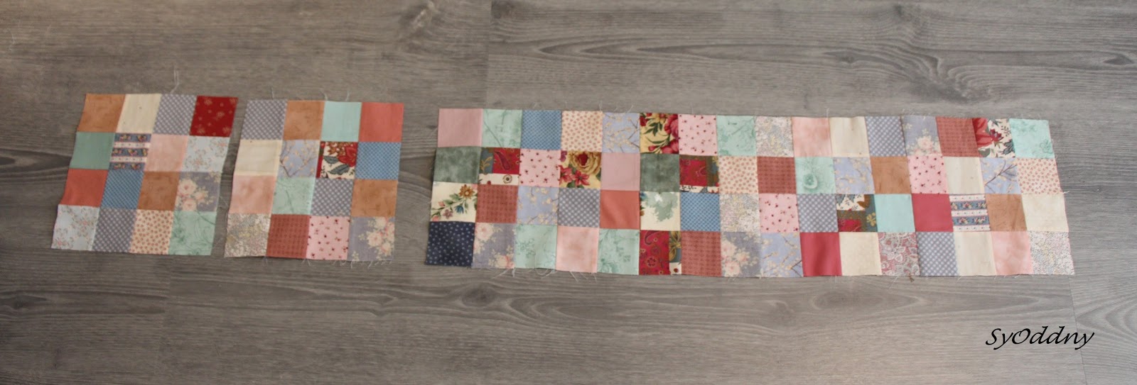 Det norske flagg gav meg inspirasjon å sy spisebrikker. Det blir kjekt å dekke bordet med dei norske farger!Kok deg ein kopp kaffi og leit opp stoff i raudt, kvitt og blått! Eg har brukt bomull-stoff fra gamle skjørt, kjole, gardiner og «second hand» stoff. Kos deg med syinga av spisebrikker 🙂 På bilde er måla for alle lappane som du må skjere ut. Måla er sånn ca. Reinskjer etter kvart. Eg har brukt 1/4″ i sømmonn.