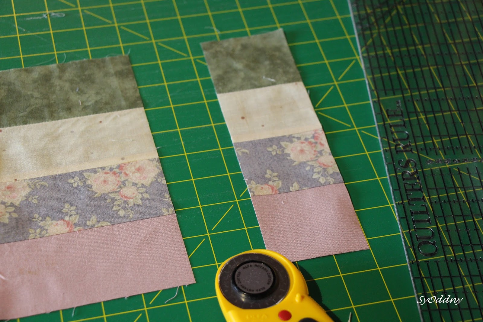 *QUILTE LINJAL; vanleg, avlang firkanta med 90 ° og 60 ° vinkel strek. (evt. «Hex N More»- linjalen, «Spider Web» – linjalen eller andre trekanta linjaler).