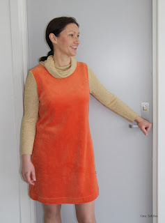 Resten av kjolen er sydd av orange strekk velour.