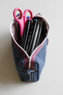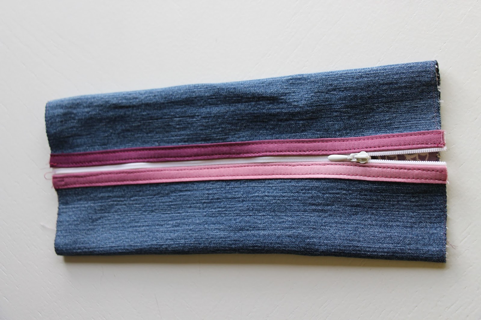 Skjer to firkanter 25cm x 29 cm; Ein firkant i ytterstoff, her dongri og ein firkant i for, her eit bomullstoff. Ein kan evt. legge inn i bordvatt for å gjere penalhuset stivare og stødigare.