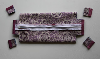 Klipp remser på ca 5 cm og skjul sårkantane med desse remsene. Kan også bruke skråband. Her bruker eg ikkje kantebandsapparatet for eg synest det blir for tjukt. Men syr på bandet ved to saumer. Legg bandet kant i kant ved enden av penalhus . Sy ein søm.