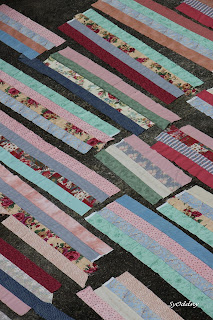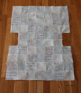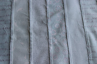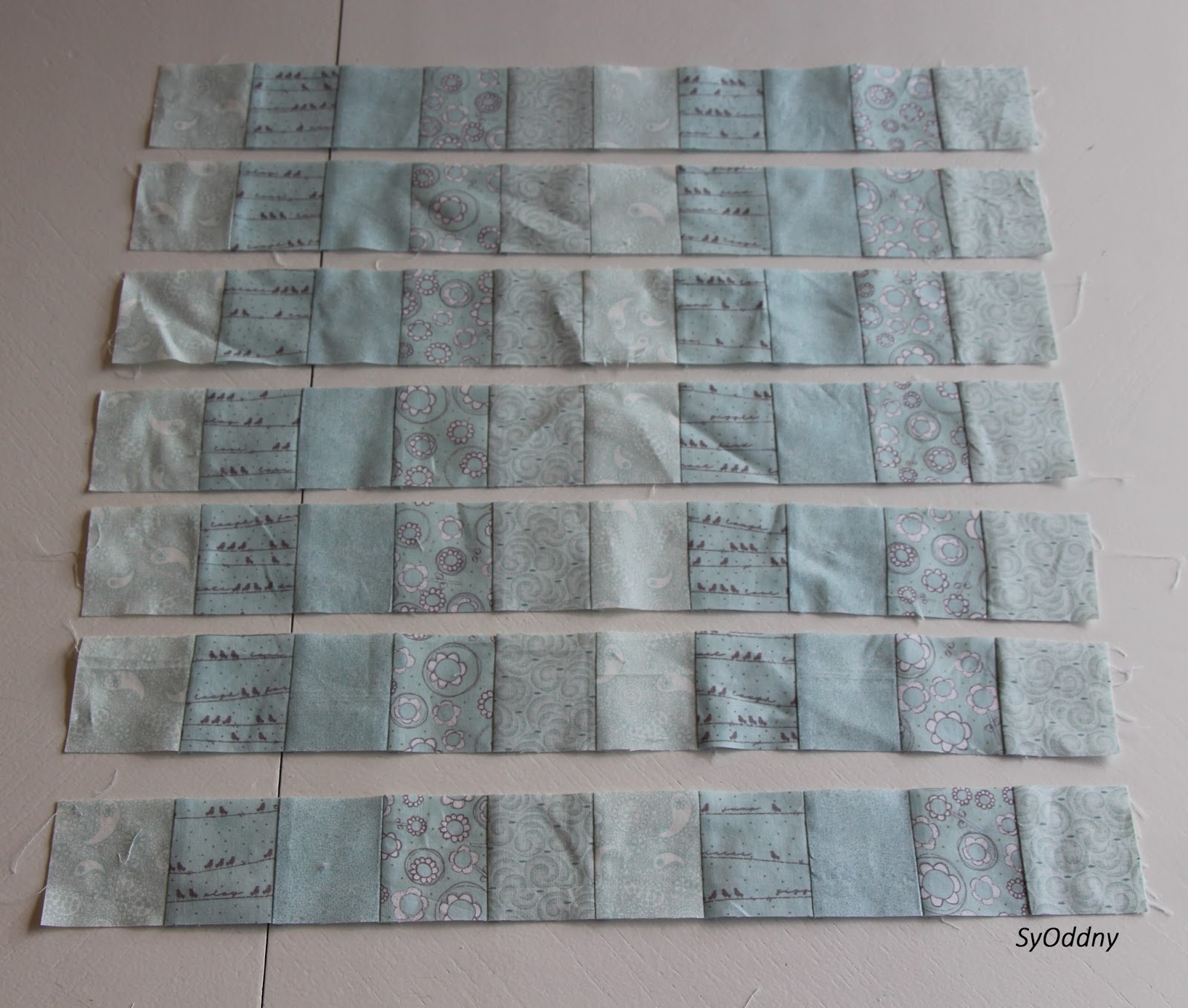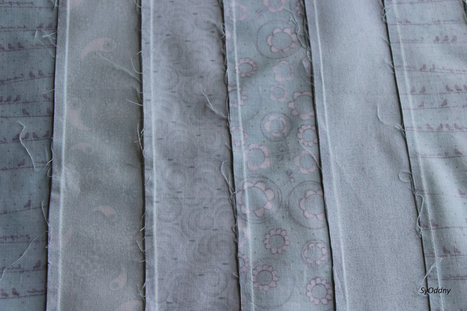 Eg sydde ihop lappane. Først sydde eg ihop 7 lapper til remser.