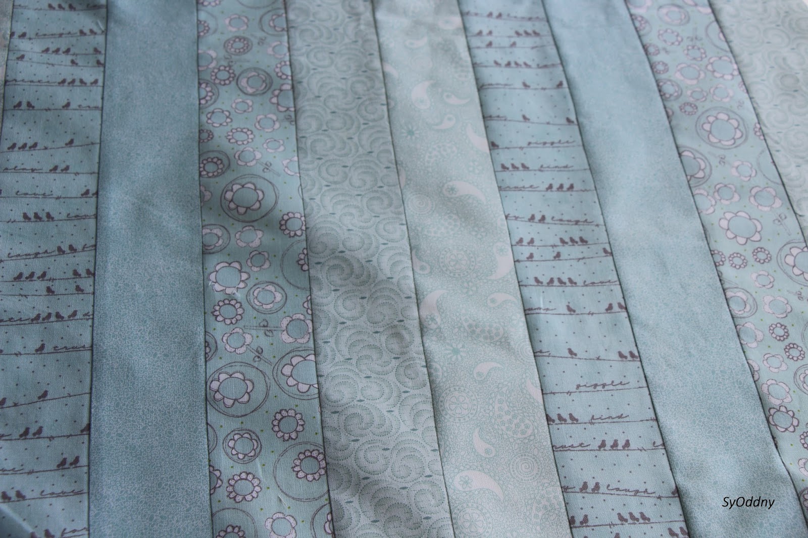 Så sydde eg ihop remsene til eit stort teppe