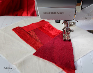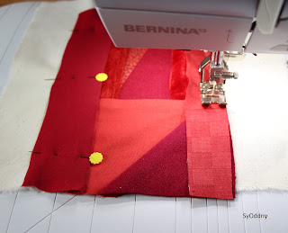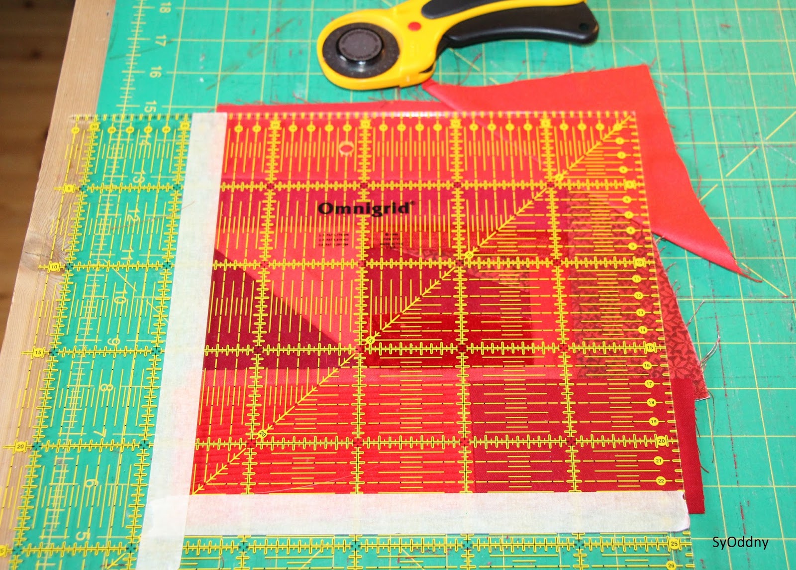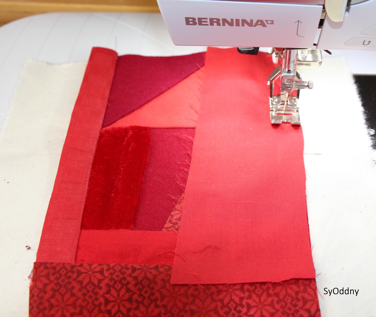 Sydde på neste remse, slik at alle 9 firkantane vart sydd saman til ein stor kvadrat.