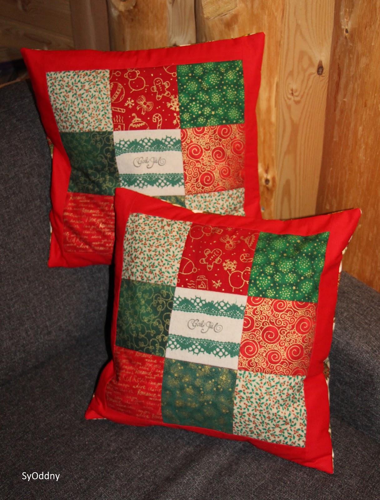 9 kvadrat til ei pute; 4,1/2 » x 4, 1/2 (ca 11,5 cm x 11,5 cm).